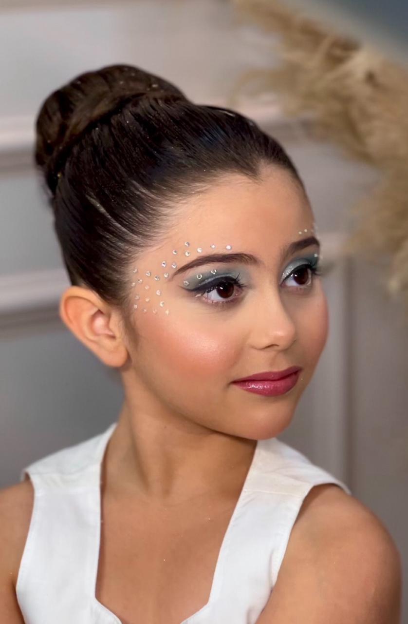 • Maquiagem leve e luminosa, adaptada à luz fotográfica.
