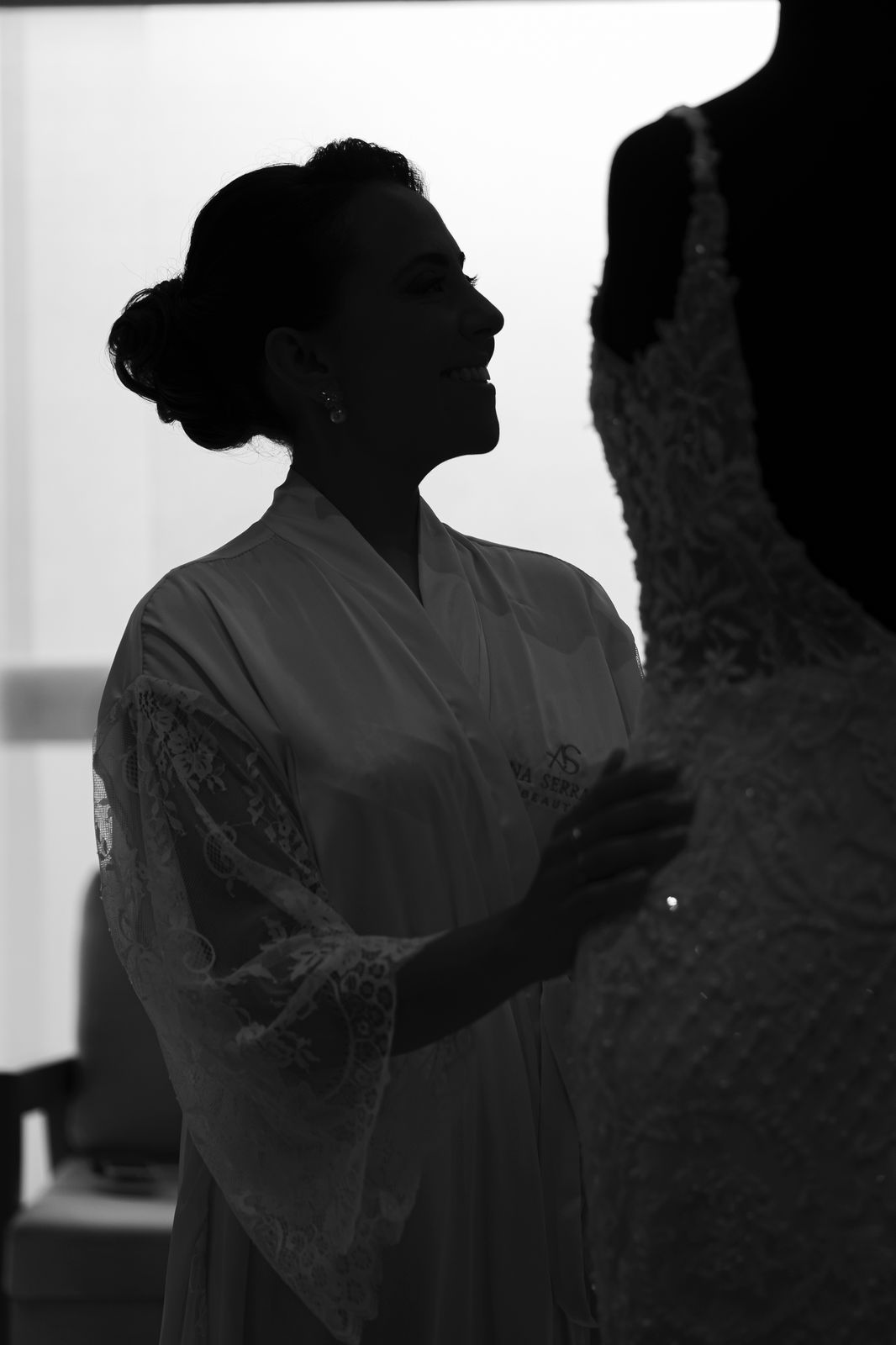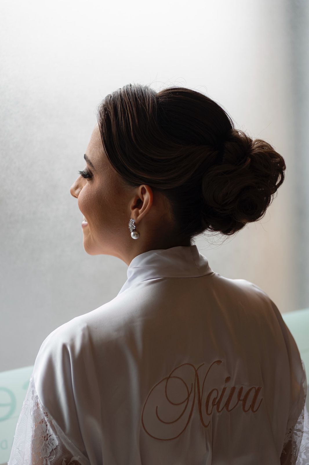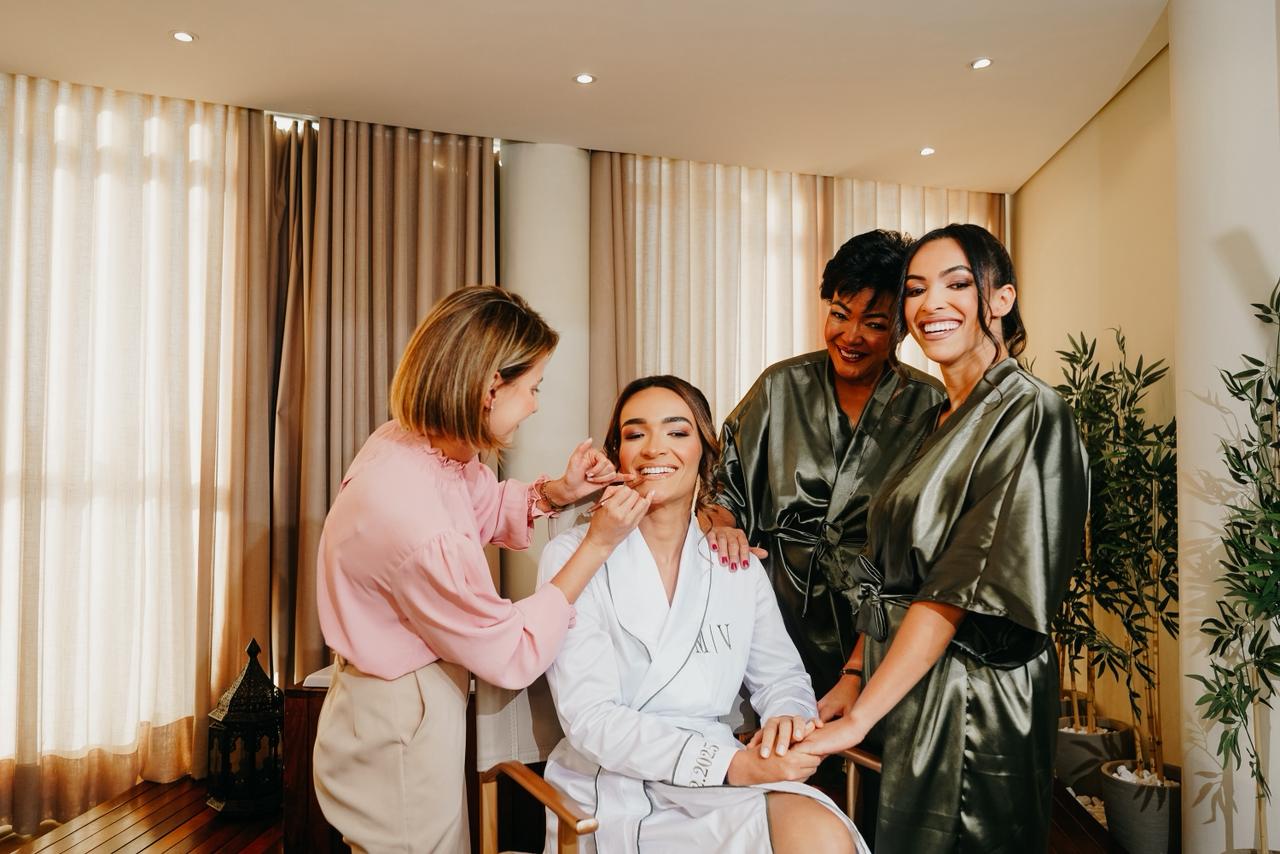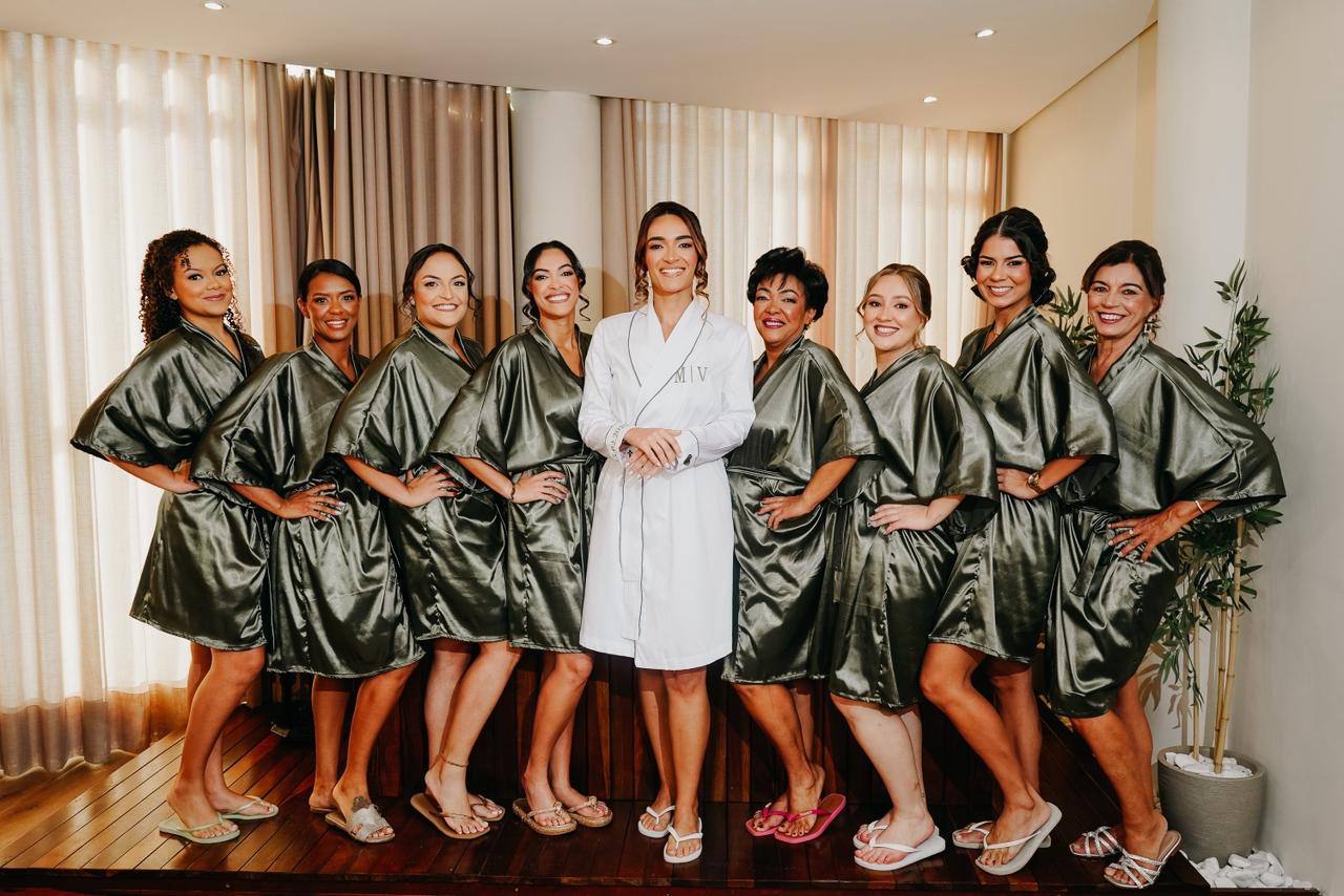 A noiva recebe robes exclusivos, em tecidos leves e elegantes, pensados para valorizar as fotos e proporcionar conforto durante toda a preparação.